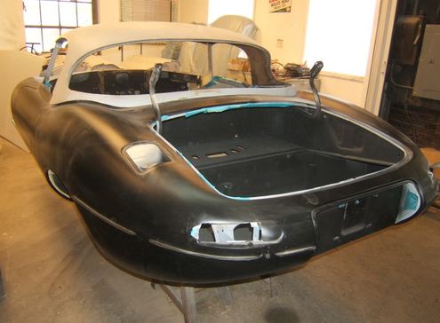 This 3.8 Jaguar E-Type Roadster (originally called Open Two Seater) is stuck in the middle of a total restoration: much body work has been performed but the end of this work is way far to be reached. The car has also a rare hardtop, which is an expensive aftermarket item to buy.
