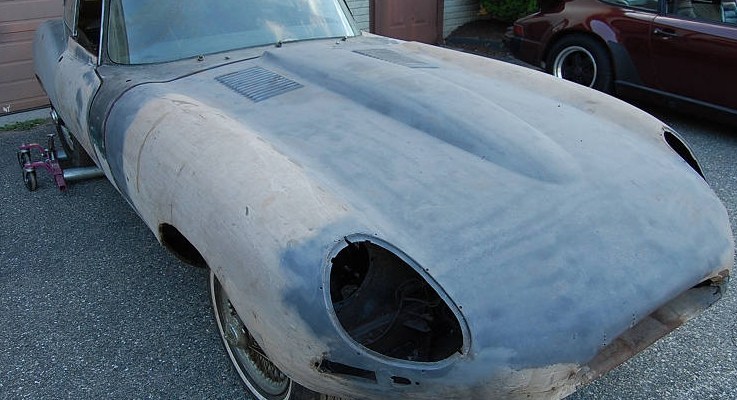 This 1st series E-Type has arrived to us from the early days of rock’n’roll: watching those very old tires it’s clear that this former car has been abandoned somewhere many years ago and then cannibalized of its engine and transmission. Now it’s just a rolling chassis.