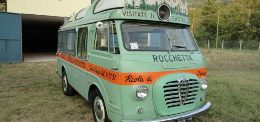 It’s actually a 1956 Romeo bodied by Boneschi in order to advertise tourist trips to a castle near Bologna: its shape is unique and very funny in some way. It looks to have a roof made with metal and perspex, the contour of the castle on the front and a couple speakers both on the front and the rear.
