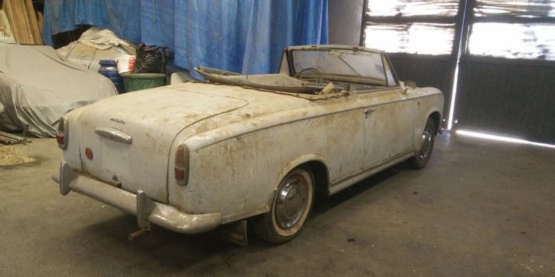 It is a Peueot 403 Cabriolet, built from 1958 to 1960 by Pininfarina in little more than 2000 specimens, of which some tens still survive. In the past we have published other 403 Cabriolets for sale but none of those were in conditions “barn find” like this specimen that, at least from its appearance, seems to have been abandoned in a shed for a few decades.