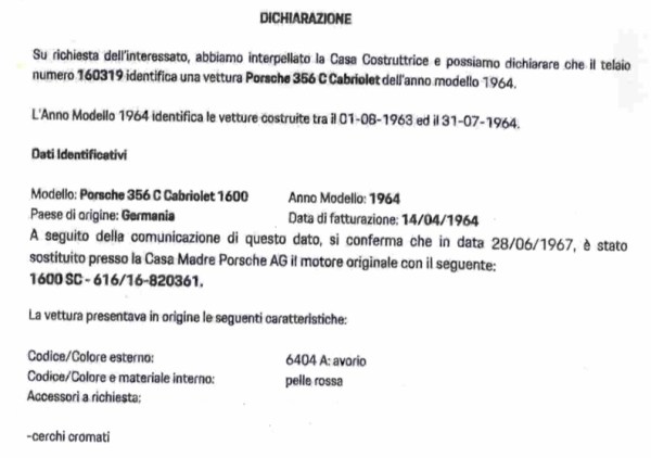 This car – according to the Porsche certificate – appears to have been born in the same color as the photos show, although the interior was originally red. The engine is not the original one but the certificate states that in 1967 it has been replaced by the factory but from the photos there is no way to see if the one currently installed has a number that matches the one shown on the certificate. Otherwise the car seems like a very good driver. Find it for sale here in Genova, Italy, with a starting price of €79,000 (today $85,000)