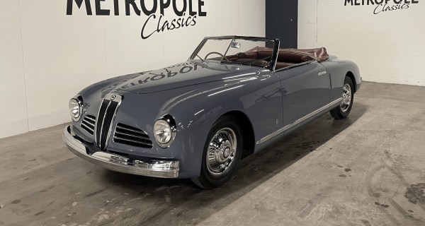 An example of how Pininfarina’s style is expressed on a car is this beautiful convertible built on the base of a 1947 Lancia Aprilia, for which slate gray was chosen for the exterior and a stunning brick red for the interior. Lancia historian Marco Giusti notes that the design bears the direct influence of lead Pinin Farina stylist Fedele Bianco, who clearly used this opportunity to improve upon his previous 2+2 cabriolet treatment which claimed top honors at the 1947 Monte Carlo and Cannes concours d’elegance. Aptly termed the “Speciale,” this prototype was clothed in a one-off aluminum body featuring sloping sides, open wheels, swept-back windshield, and a low profile.