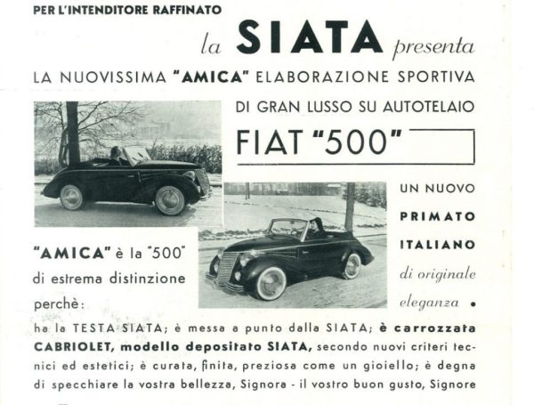 However, the most distinguished model from SIATA was not a sports car but an elegant convertible, the famous “AMICA,” built on a Fiat 500 base. Designed by Bertone, the Amica was first introduced in 1939, retaining only the chassis and mechanical layout from the Fiat 500A. Significantly, this was the first time in history that FIAT supplied bare chassis to an external company for outfitting. The Amica stood out for those who wished to distinguish themselves from the broader Fiat 500 clientele, offering a blend of elegance, technical quality, speed, practicality, and comfort without being ostentatious. The original 500’s engine was modified with SIATA’s “Supertesta” overhead valve head, increasing power from 13 to 18 horsepower, enabling speeds over 100 km/h.