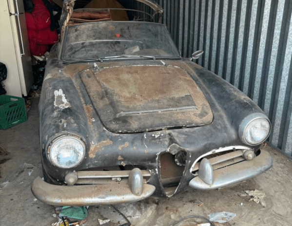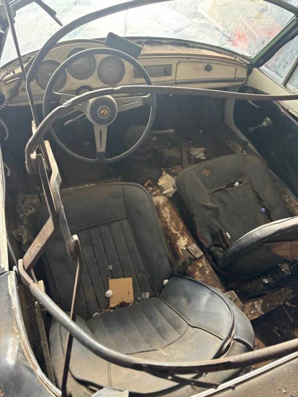 Let’s continue with Alfa Romeos in need of restoration, this time with a spider, specifically a 1965 Giulia, which is the last series of its kind, featuring the three-spoke steering wheel and SS instruments, although it still lacks front disc brakes.