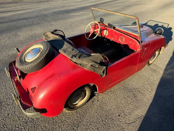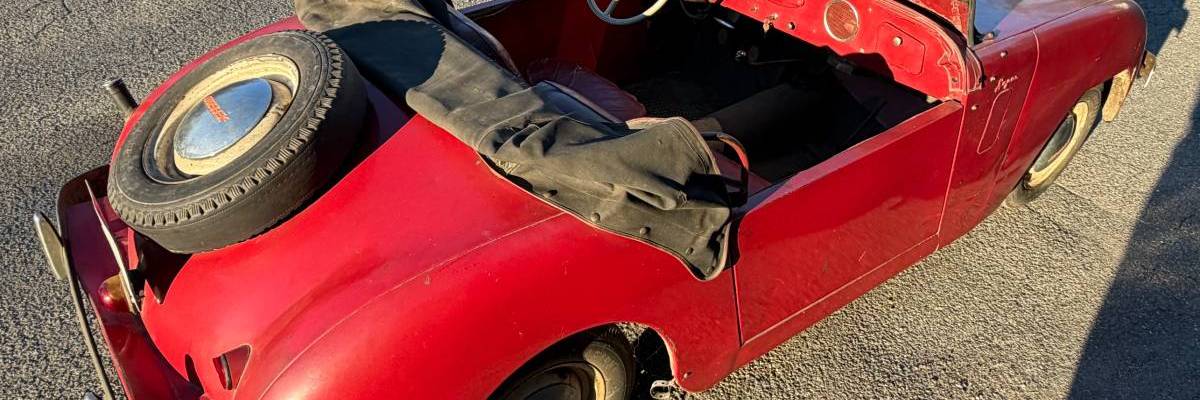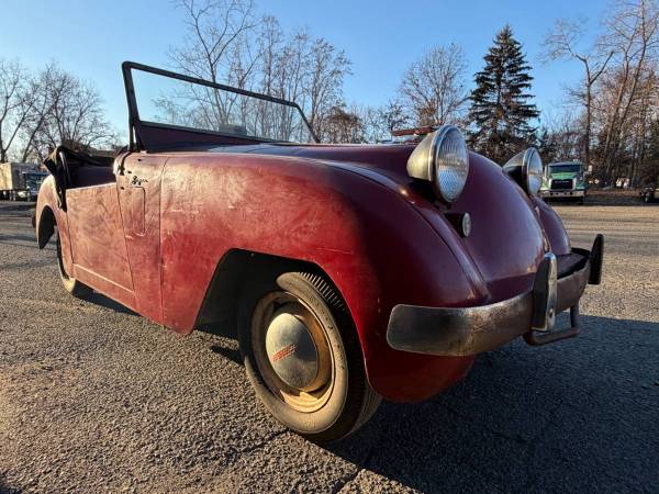 Crosley automobiles were produced by Powel Crosley Jr., an industrialist known for consumer electronics and household appliances. The company’s automotive division aimed to offer cars that differed from standard American models of the time: smaller, lighter, and more economical. The Super Sport was introduced toward the end of Crosley’s production run and incorporated the company’s CIBA four-cylinder engine, a compact unit derived from military applications and known for its stamped-steel construction. This Super Sport retains its original layout and components. The interior, finished in red, shows age-related wear but appears complete. The exterior panels and windshield frame match the model’s original configuration, and the seller confirms that the car includes its canvas top and side curtains. The engine bay presents an unmodified layout, consistent with period specifications, and the rear-mounted spare wheel and Crosley-branded hubcaps are still present.