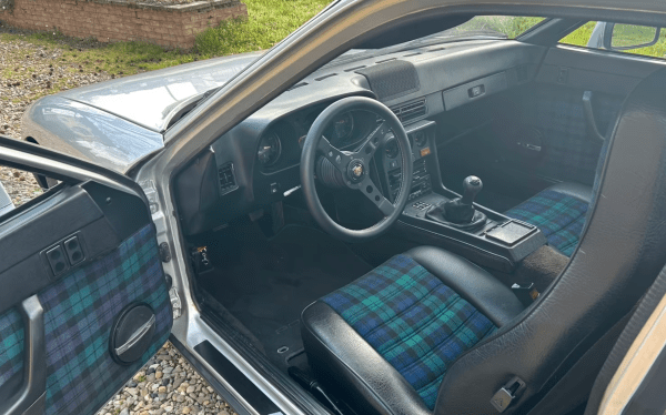 This particular example stands out for a few very concrete reasons. It still carries its original registration plate, which matters because it suggests continuity of identity rather than a car rebuilt around paperwork later on. Visually, the car appears to be in excellent condition, with straight bodywork and tidy trim, and the two-tone paintwork suits the 924’s geometric shape particularly well—an unapologetically “of the time” look that works on this design. Inside, the green tartan upholstery is the most telling detail: it immediately places the car in its period and signals a specification that hasn’t been stripped of its original personality.