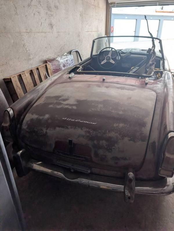 This car is clearly a full restoration project rather than a quick mechanical revival. According to the seller, it is a California car with no more than minor surface rust, still showing its original undercoating, and its removed 2.0-liter four-cylinder engine and five-speed transmission are included. The listing also mentions the convertible top frame, a rare hard top, and a quantity of extra parts including grille pieces, lighting components, seals, trim, electrical items, and an additional hood. From the photos, though, the car appears long disassembled and well beyond simple recommissioning: the engine bay is empty, the front lights are missing, the paint has been heavily worn or stripped, the wiring will need sorting, and the interior also looks incomplete and tired.
